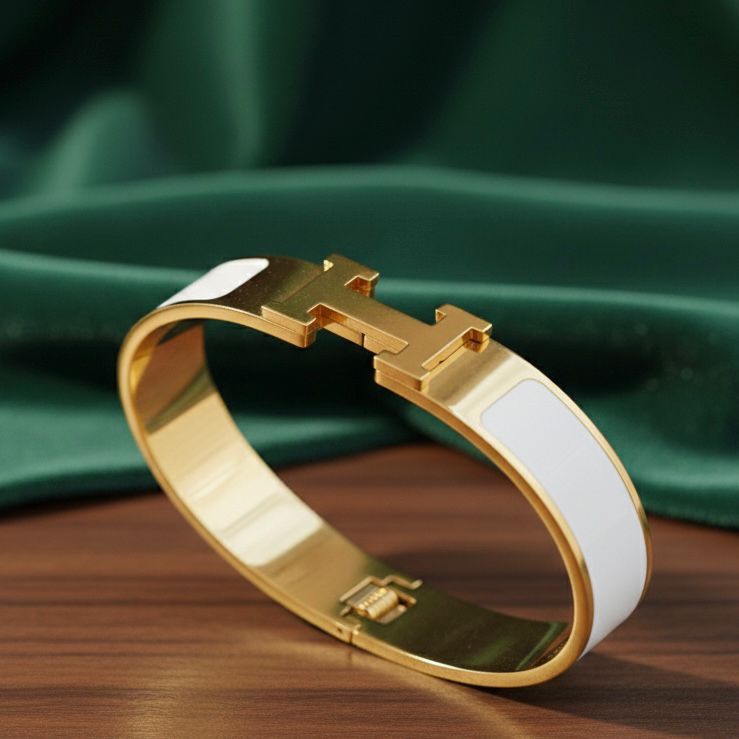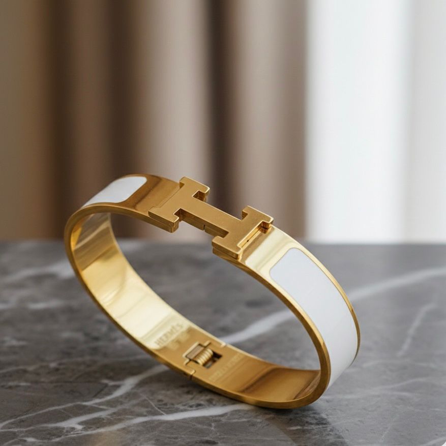 Luxury Gold & White H-Style Bracelet – where elegance meets modern fashion. Crafted from premium stainless steel with a glossy gold finish, this bracelet features a clean white enamel inlay and an iconic H-inspired clasp for a bold, classy look.